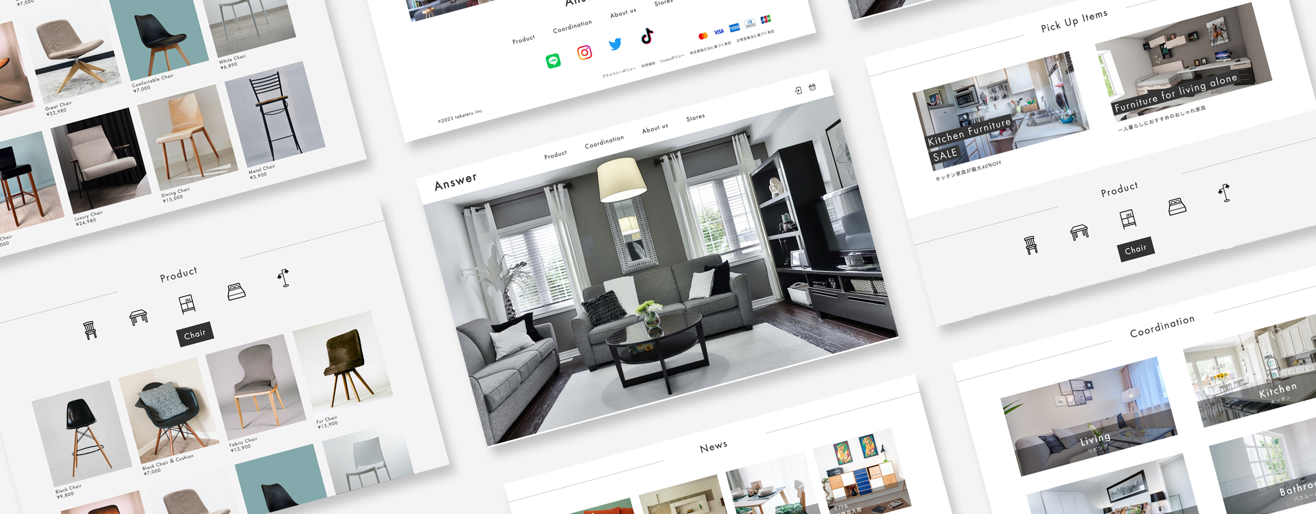 洗練された印象を与えるために、モノトーンの配色とFuturaフォントを使用し、シンプルながらもスタイリッシュなデザインを採用しています。 Productページでは家具屋としての世界観と利便性を両立させるため商品ジャンルのタブに家具のアイコンを使用し、直感的に操作できるデザインにしています。また、See moreボタンでは、jQueryを用いて引き出しを開けるような動作を取り入れ、インタラクションの楽しさを加えました。 さらに、利用シーンをイメージしやすいように家具の組み合わせ例を提案し、単品購入だけでなく、まとめ買いを促進する設計になっています。